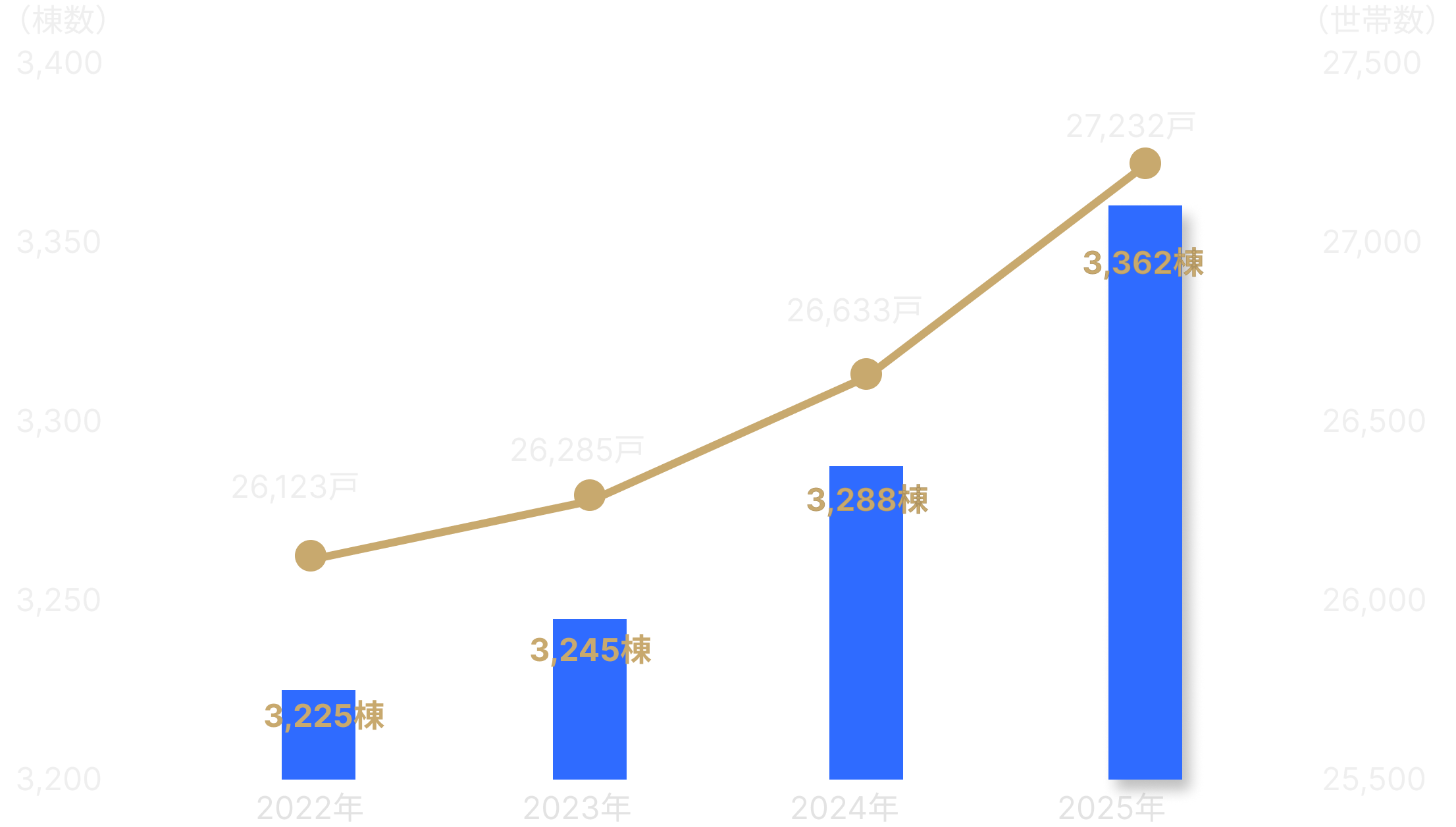2022年から4年連続で棟数・世帯数ともに増加。2025年には3,362棟・27,232世帯に達し、多くのデベロッパー・管理会社様にご選択いただいています。